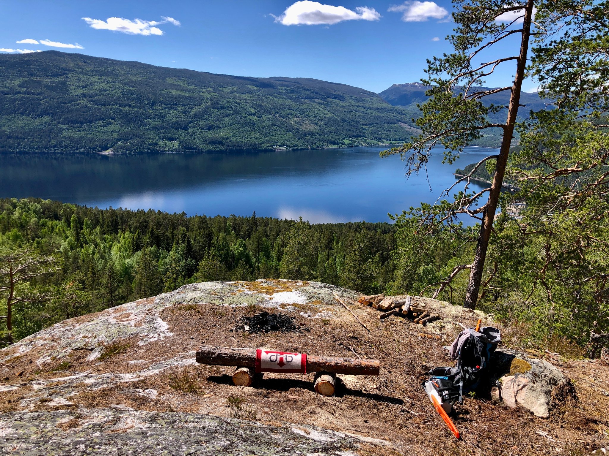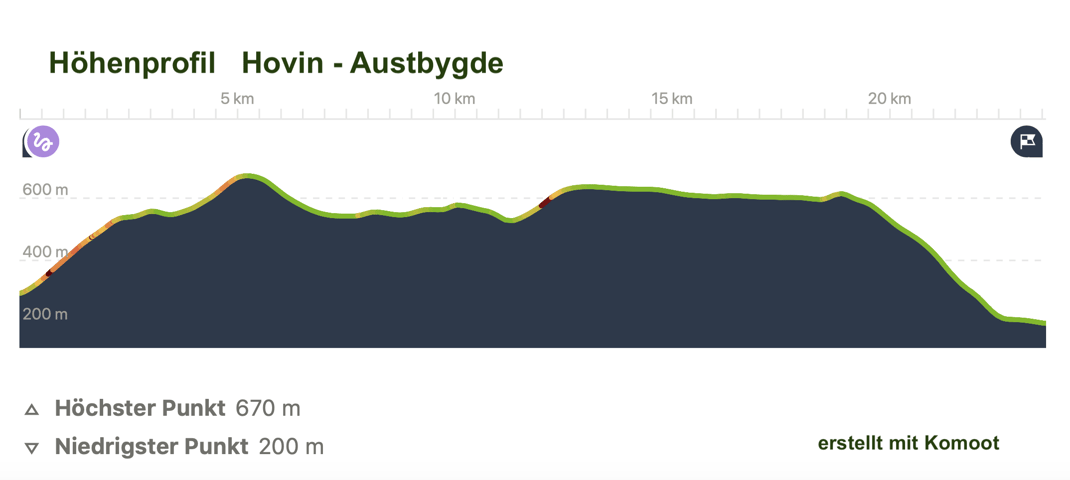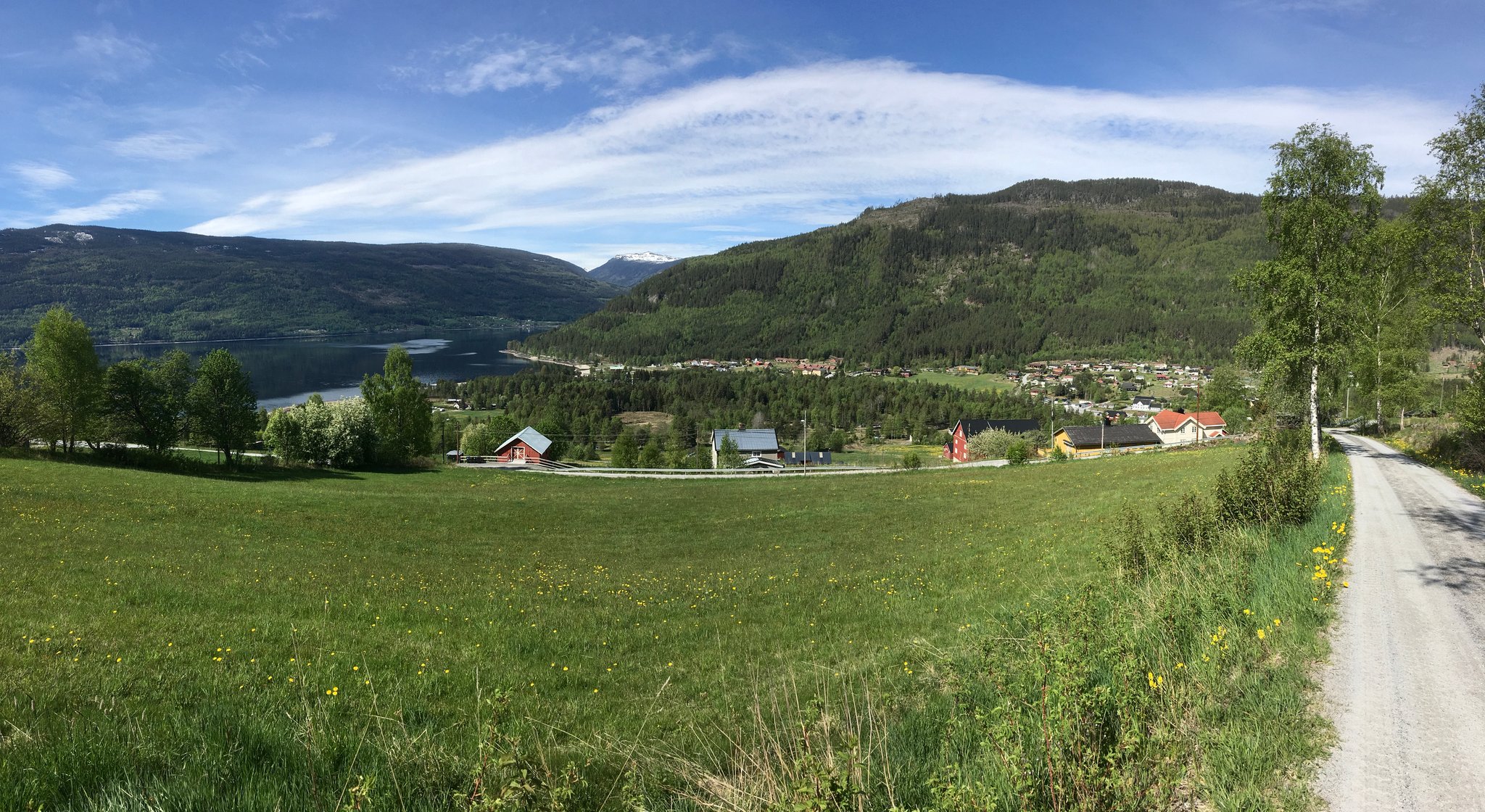 Ihr biegt nach links ab und folgt der Strasse etwa 1 km. Achtet auf den Verkehr, auf der etwas unübersichtlichen und kurvigen Strasse. In einer S-Kurve biegt ihr nach recht in einen Schotterweg ein, der meist mit einer Schranke verschlossen ist. ihr dürft also wieder einmal ein wenig klettern. Direkt vor euch, in einer Kurve, seht ihr dann eine Bank stehen. Ihr folgt dem Schotterweg hinein in ein Hüttengebiet, das "Hafoss vel" heisst und direkt oberhalb eines Sees liegt. Der Schotterweg folgt dem See, der zu eurer Linken liegt. Am See gibt es einige schöne Rastmöglichkeiten und Bänke für eine Pause. Nach etwa einem km führt der Schotterweg nach rechts vom See weg. Hier verlasst ihr den Schotterweg und folgt dem Weg, der gerade aus weiter am Ufer entlang führt. Wenn der Weg das Hüttengebiet verlässt, überquert er ein kleines Stück Moor. Dort hat man einige Holzbalken und Paletten hingelegt, damit es trotzdem trockenen Fusses zu passieren ist. Im Anschluss an das Moorgebiet führt euch der Weg ein kurzes Stück bergan wieder in den Wald hinein. Nun folgt ein schöner, verwurzelter Waldweg in ständigem leichten auf und ab und über einige alte einfache Brücken durch den Wald. Nach etwa 3 km auf diesem schönen Waldweg stosst ihr nach einem kurzen etwas steileren Abstieg auf einen Schotterplatz mit einer Grillstelle. Ihr überquert den Platz am linken Rand und stosst direkt auf einen Schotterweg. Auf der gegenüber liegenden Seite des Schotterweges, setzt ihr euren Weg auf der alten "Hovin Heia" fort. Am Anfang geht es ein, meist sehr feuchtes, Stück über Gras, bevor es noch einmal ein kurzes Stück steil und steinig bergauf geht. Auf der Höhe angekommen geht der Weg aber wieder in einen schönen Waldweg über, der euch langsam aber sicher bergab Richtung Austbygde führt. Der Weg ist nun teilweise sehr ausgewaschen und steinig und man kann sich gut vorstellen, dass sich die Bauern vor fast 100 Jahren ein Zubrot, mit dem Heraufziehen von Autos, verdienten. Nach etwa 1 km liegt auf der rechten Seite einer der alten Höfe, die damals noch an der "Hauptstrasse" und heute irgendwo im nirgendwo liegen. Etwa 200m weiter liegt ein weiterer Hof, versteckt hinter Bäumen, zu eurer Rechten und ein Schild weist euch nach links, einen schmalen Trampelpfad folgend zu einem wunderschönen Aussichtsplatz hinauf. Hier oben liegt ein kleines "Felsenmeer", von dem aus ihr einen wunderschönen Blick über den Tinnsjø bis hinüber nach Mæl (zur Linken), sowie Atrå und Austbygde (zur Rechten) habt.