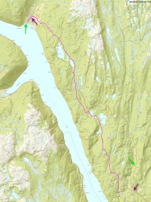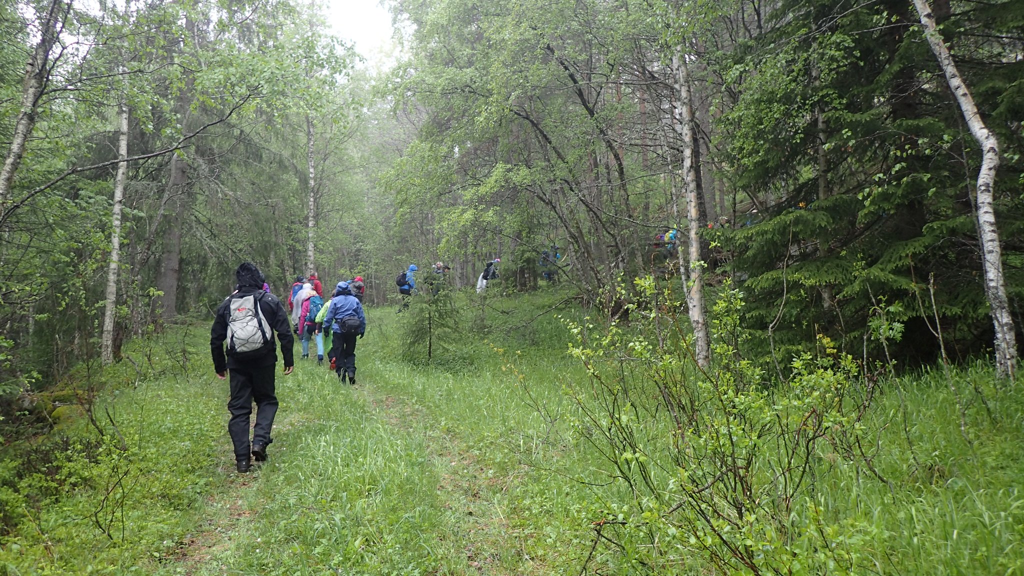 Nach dieser kleinen Pause geht ihr zurück zum Schotterweg und folgt ihm nach rechts weiter bergab, bis ihr in einer Linkskehre (nach 200m) gerade aus einen Grasweg seht. Diesem Grasweg folgt ihr stetig ansteigend, immer gerade aus durch den Wald. Nach etwa 1 km stösst er auf einen Schotterweg, der nach links zu einem Hof führt. Folgt dem Schotterweg gerade aus bergan und haltet euch immer auf dem Hauptweg, von dem ab und zu Wege zu unterschiedlichen Hütten ab gehen. Nach etwa 2 km gelangt ihr an die neue "Hovin Heia", die Hauptstrasse zwischen Kongsberg und Tinn.