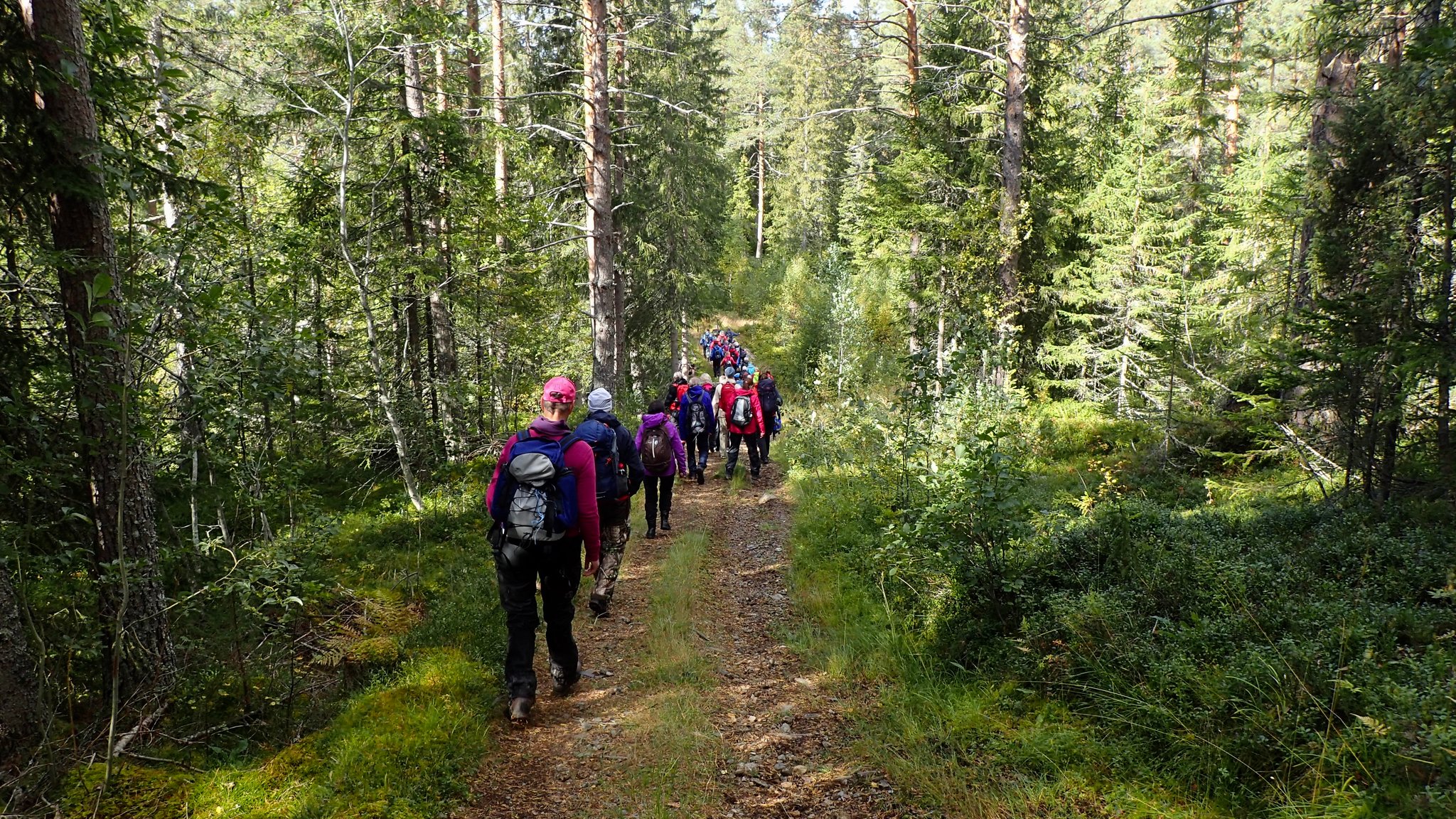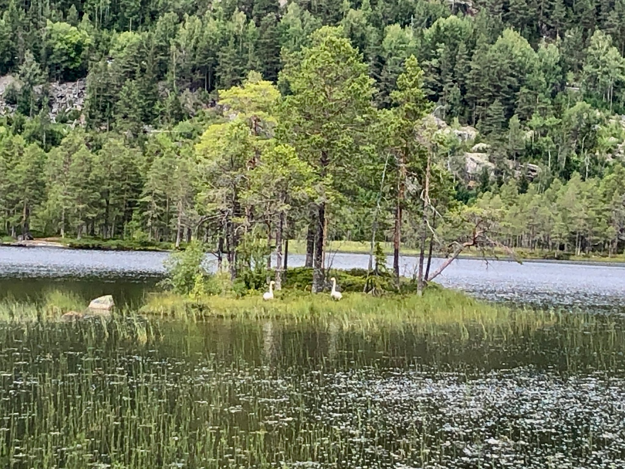 Anschliessend folgt ihr dem Kjerrevei weiter, nun abwärts durch Wald und teils offenerer Landschaft mit Felsen, Moos, Heide und Beeren. Nach 2,5 km gelangt ihr an einen See, der zu eurer linken Seite liegt. Ihr folgt dem Weg immer direkt entlang des Sees. Ein Stück führt der Weg durch moorige Landschaft und der Weg kann, je nach Jahreszeit und Wetter, sehr feucht sein.