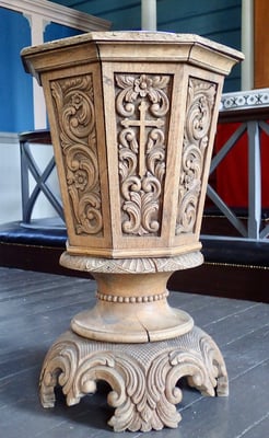 The baptismal font is made of carved oak and was made by Søren Nedrebø in 1950. He also carved the bridal chairs.