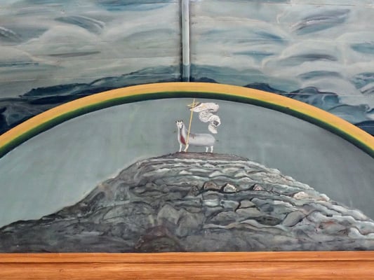 The altar, in the main area the yellow cross on a blue background, above it the lamb with flag (the victorious Christ) standing on the top of a mountain. On each side of the altar there is a portal as access to the altar.